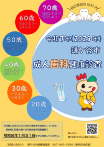 節目の年齢のかたには、受診券が届いていると思います。私も以前に送っていただいた受診券を紛失してしまい、再発行してもらいました。この機会に、【鎌ケ谷市成人歯科検診】を受診してみてはいかがでしょうか。ちなみに、受診期間が1月31日までとなっていますので、早めの予約をお願いいたします。