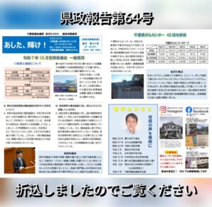 それと、私が発行する【県政報告第64号】、ちば県民だより、広報かまがや、鎌ケ谷市議会だよりの折込日と同じく折込しました。手にとったさいは、是非ご覧いただき、一人でも多くの方と千葉県・鎌ケ谷市の未来を考えたいと思います。千葉県議会議員松沢たけひと