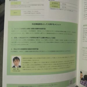また、アカデミーコモンの1階では、明治大学公共政策大学院のパンフレットも置いてあり、今年度のパンフレットにも、私が掲載されています。科目履修しながら、1年半長い、3年半も通った学び舎です。