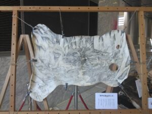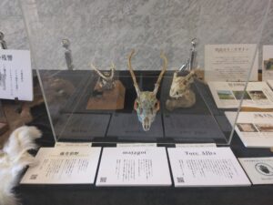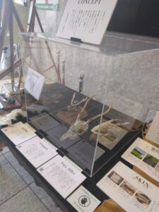 ジビエアート作品が千葉県庁の本庁舎1階ロビーで並んでいます。千葉県では、才能豊かな若手アーティストを発掘、支援する【アーティスト・フォローアップ事業】を実施していて、今回は館山市でレザー製品を製作・販売している【伝右衛門製作所】さんが、【キョン】等、駆除された野生動物の皮や骨を加工して制作したアート作品を展示しているんです。千葉県庁に来所する機会がありましたら、是非ご覧いただきたいと思います。