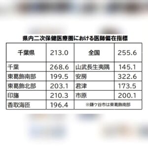 千葉県における医師数をもとに算出した医師全体についての医師偏在指標は、令和2年末で千葉県213.0、東葛飾南部199.5と全国平均255.6を下回っており、病床が不足するとされた東葛飾南部(鎌ケ谷市)の保健医療圏において、病床配分を実施することとなりました。